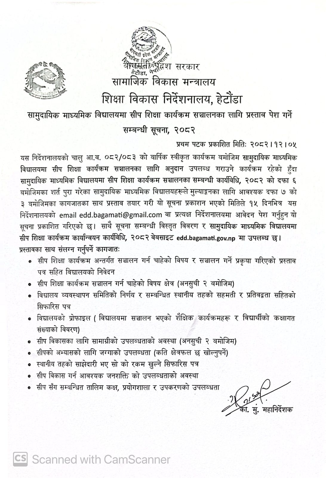 सामुदायिक माध्यमिक विद्यालयमा सीप शिक्षा कार्यक्रम सञ्चालनका लागि प्रस्ताव पेशको सूचना, 2082