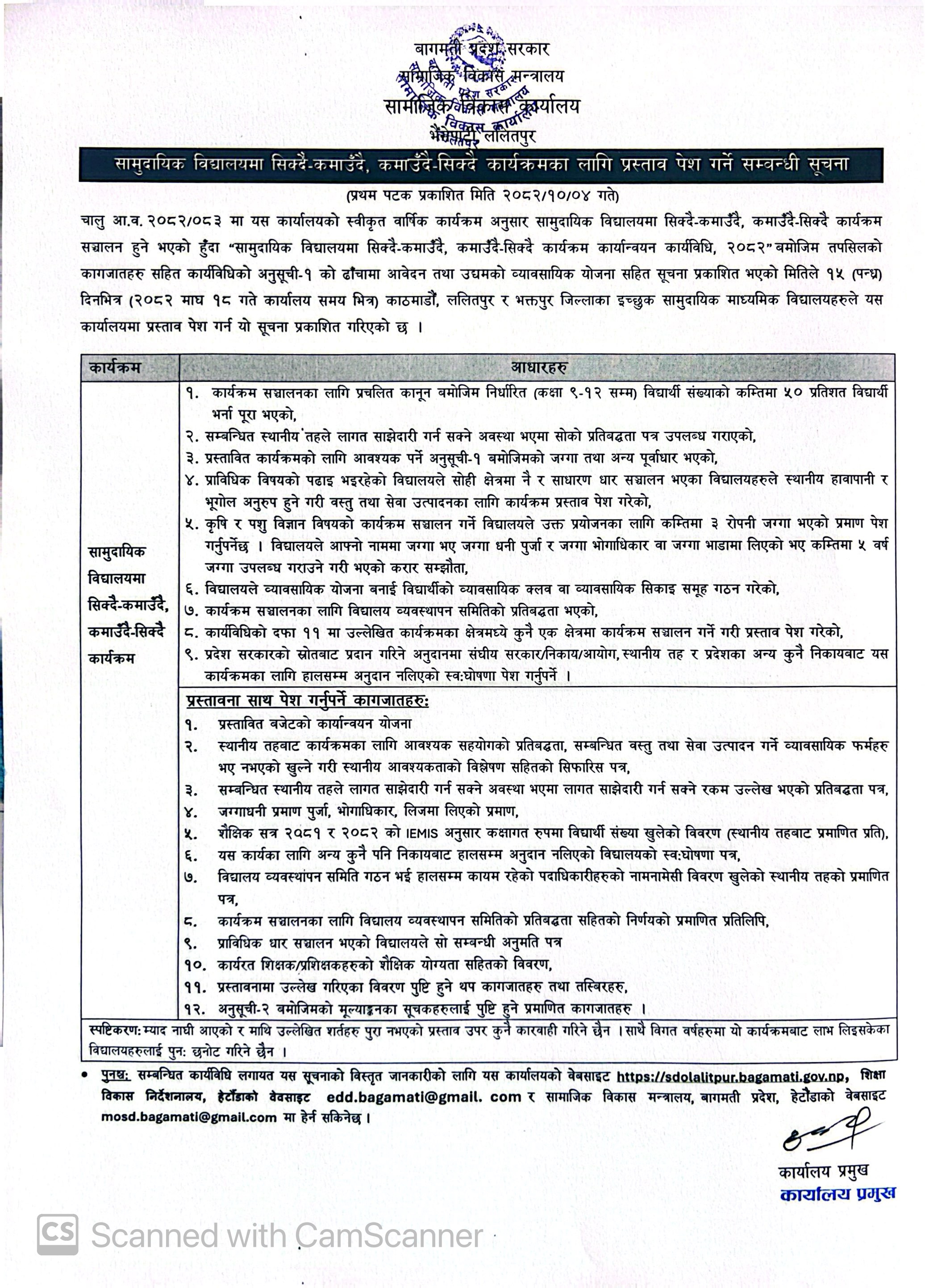 S.D.O. ललितपुरको सामुदायिक विद्यालयमा सिक्दै-कमाउँदै कार्यक्रमका लागि प्रस्ताव पेशको सूचना । 2082